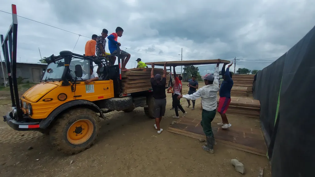 Asimismo, se realizó la compra del material de ferretería; techos; pintura y material sanitario. Luego de todo este proceso, se transportó el material en varios camiones hacia el barrio 18 de febrero, cantón Atacames, donde se levantó un centro de acopio temporal para almacenar los materiales que sirvieron para la construcción.