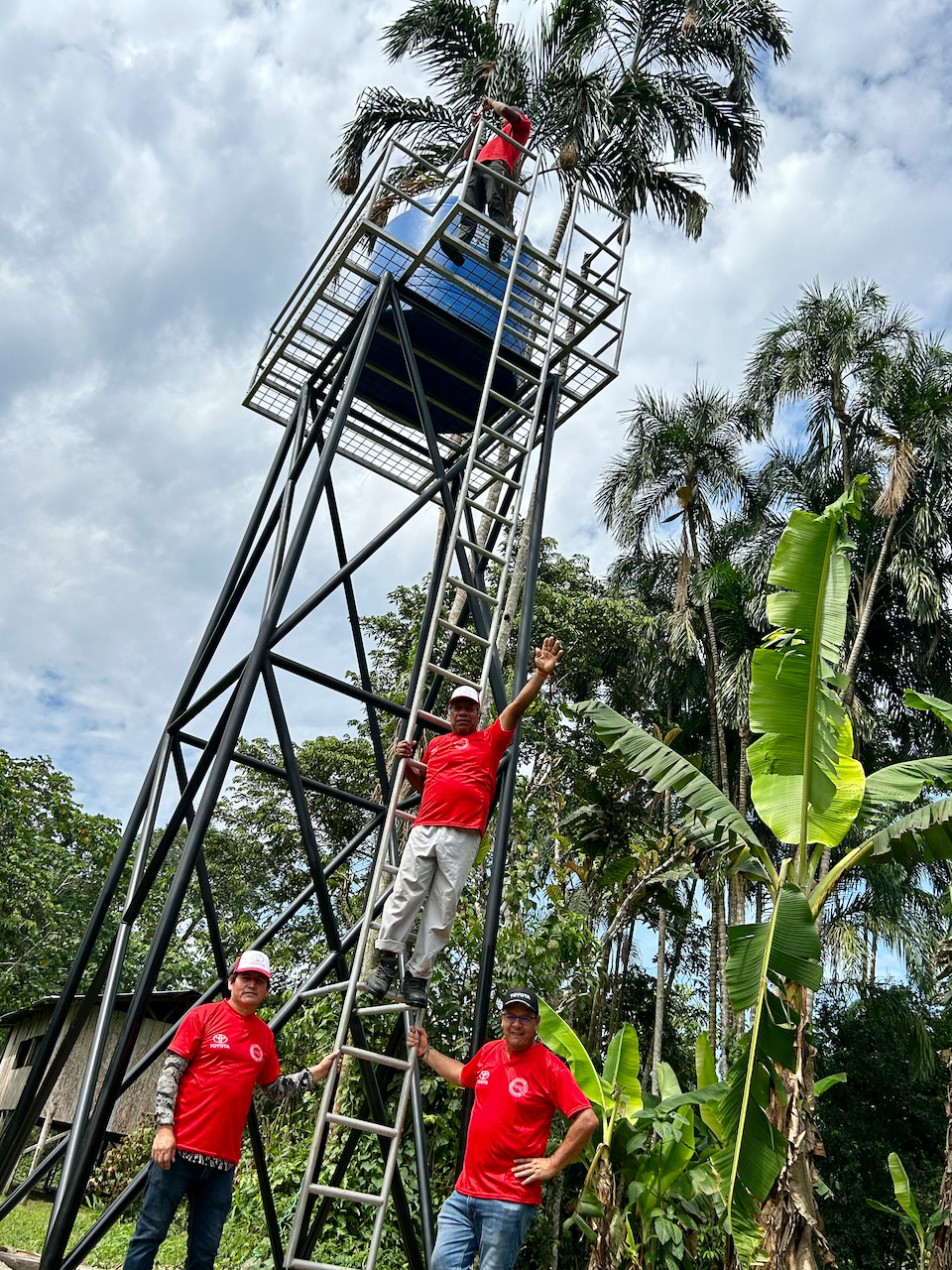 En cada comunidad se está construyendo torres de metal que sostienen tanques de agua de 2.500 litros; tiene, además, un filtro y un clorinador. De aquí, se tienden la tubería para abastecer a cada vivienda de la comunidad.