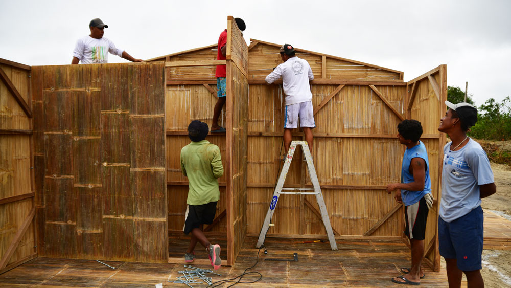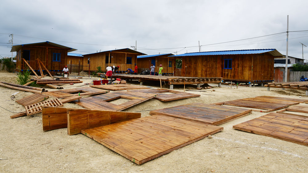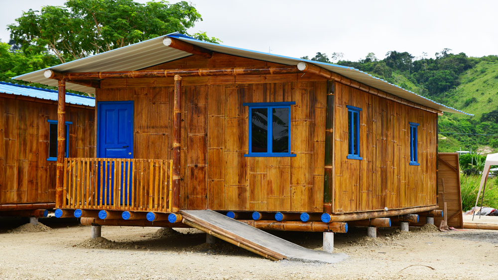 A model house that has been optimized for rapid construction, the parts are prefabricated as wooden frame panels covered with sliced bamboo previously treated in a solution of boric acid, borax and copper sulfate. The houses measure 4.8 meters wide by 9 meters deep, with a usable area of 43.20 m2 and have two bedrooms, living/dining room, kitchen, bathroom and covered patio.
