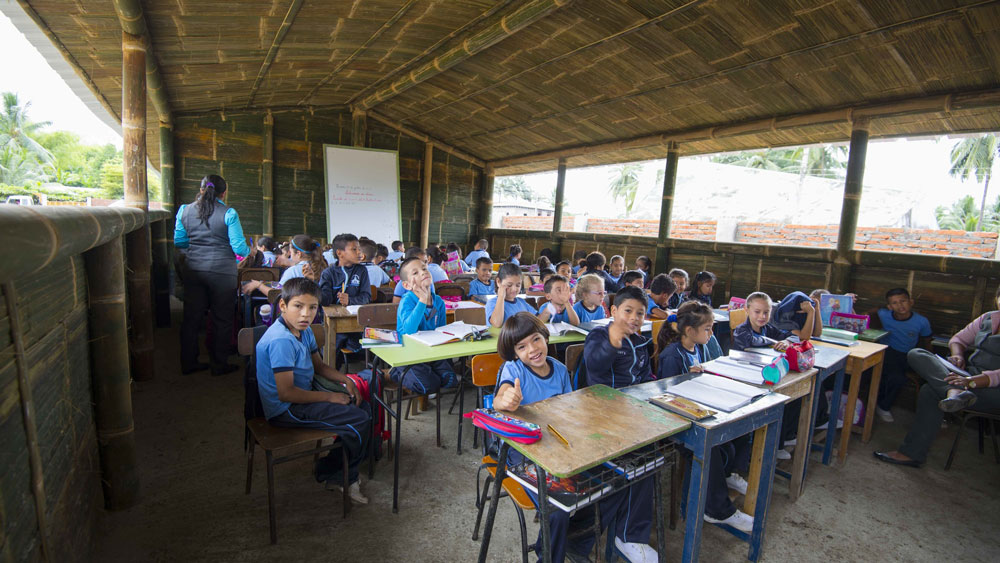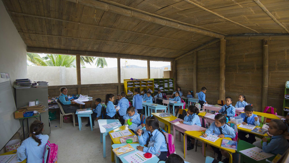 The walls are plastered on the outside to improve their resistance to weather conditions. The interior part of exposed bamboo creates a very friendly natural space for children and young people.