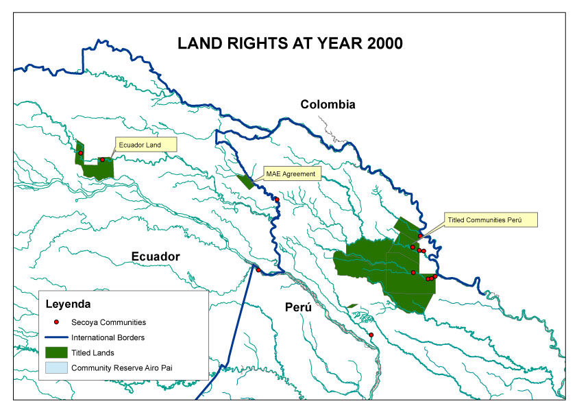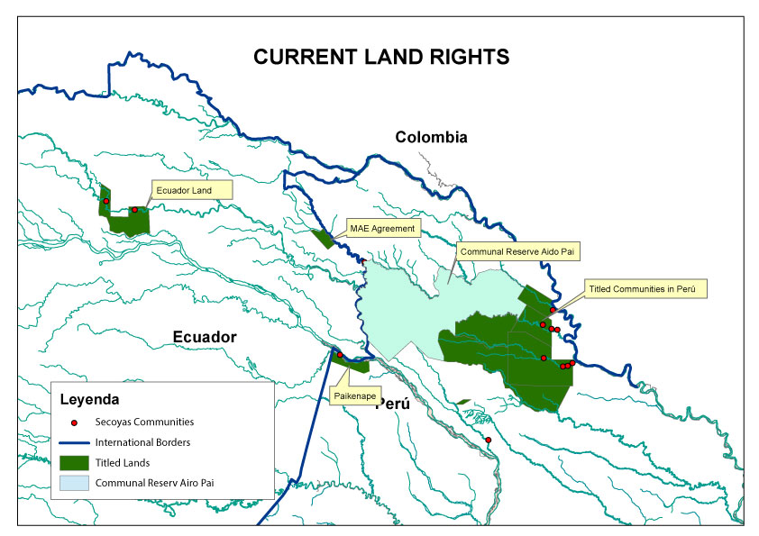 Several Secoya communities live along the border between Ecuador and Peru. In 1990, Manuel Pallares and Pablo Yépez, founding members of Fundación Raíz-CAEMBA, began a project aimed at the reunification of the Secoya people divided between Ecuador and Peru since 1941, the year in which the border was militarized and Secoya peoples were separated.
